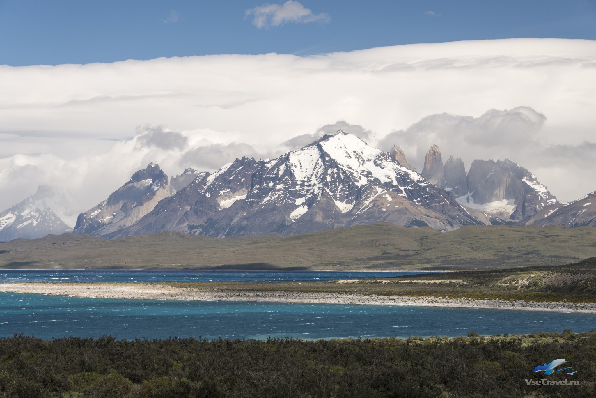 Экскурсия продолжилась прогулкой к водопаду Сальто Гранде (Salto Grande), который располагается в месте слияния изумрудного озера Норденскйолд (Norsdenskjold) и находящегося у основания гор озера Пеое (Pehoe). Островерхие Башни Торрес величественно возвышались над окружающими горный комплекс разноцветными озерами.