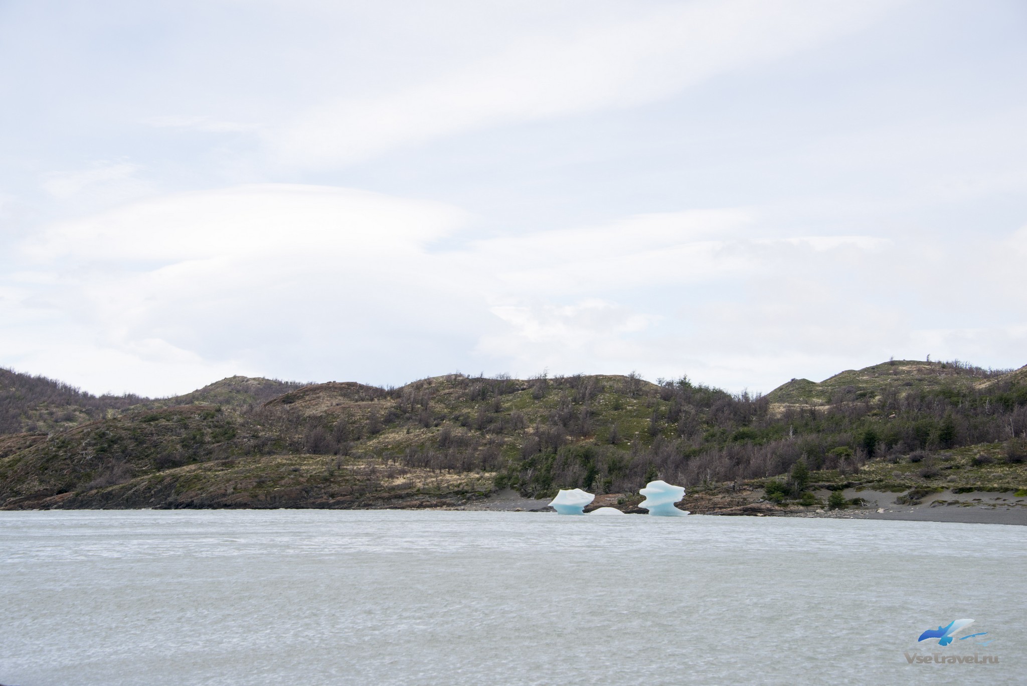 Финалом обозревания красот были озеро и ледник Грей (Grey). Путь-дорога к ним шла через субантарктические Магеллановы леса и серый каменистый берег, с которого открывался вид на озеро Грей, покрытое плавучими голубыми льдинами... Спустившись и преодолев метров 700 на продуваемом побережье с расстояния километров 10 можно было наблюдать спускавшийся с горы ледник. Лучший вид на него был сверху – с обзорной площадки на горе, куда нужно было добираться ещё минут 10 по горной тропинке под сильнейшим ветром. Погода испортилась – небо заволокло тучами, и пошёл мелкий дождик.